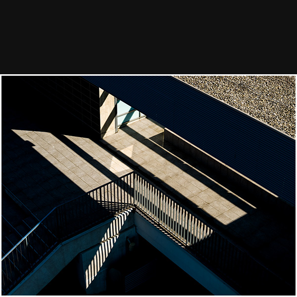 In this photograph, the railings create a rhythm of parallel lines, while their shadows build a new, almost independent structure of space. What from the street appears to be just a passage between two levels of a building, from the air transforms into a pure composition of forms — the triangle of the staircase, rectangles of pavement, and deep fields of darkness.