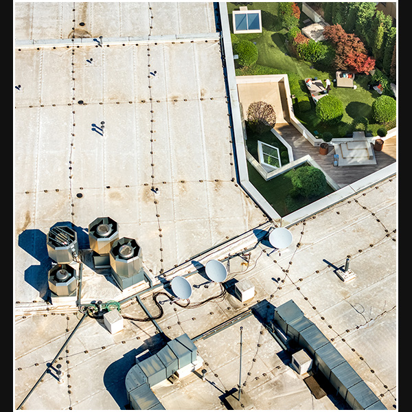 A hidden hotel garden, enclosed by industrial forms, becomes an unexpected pocket of geometric calm.
